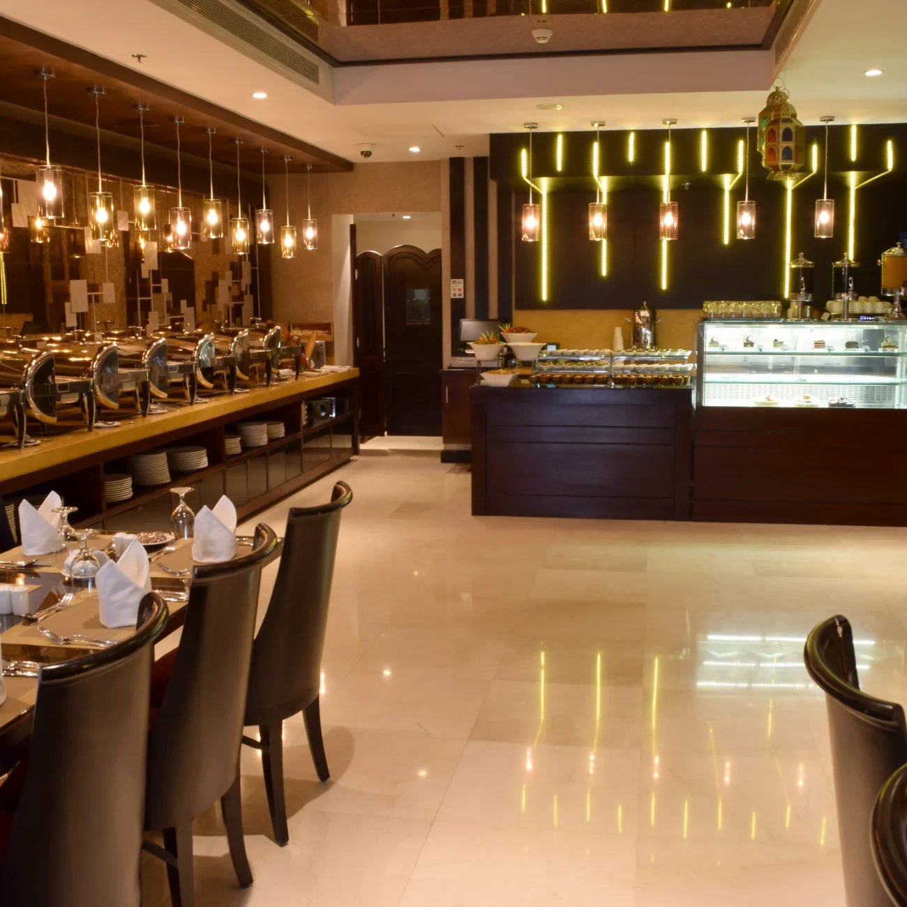 The hotel’s amenities elevate every moment: a panoramic elevator, currency exchange services, daily housekeeping, a business center, laundry and dry‑cleaning services, versatile meeting spaces, an all‑day dining restaurant, a stylish coffee lounge, high‑speed Wi‑Fi throughout the property, and valet parking.